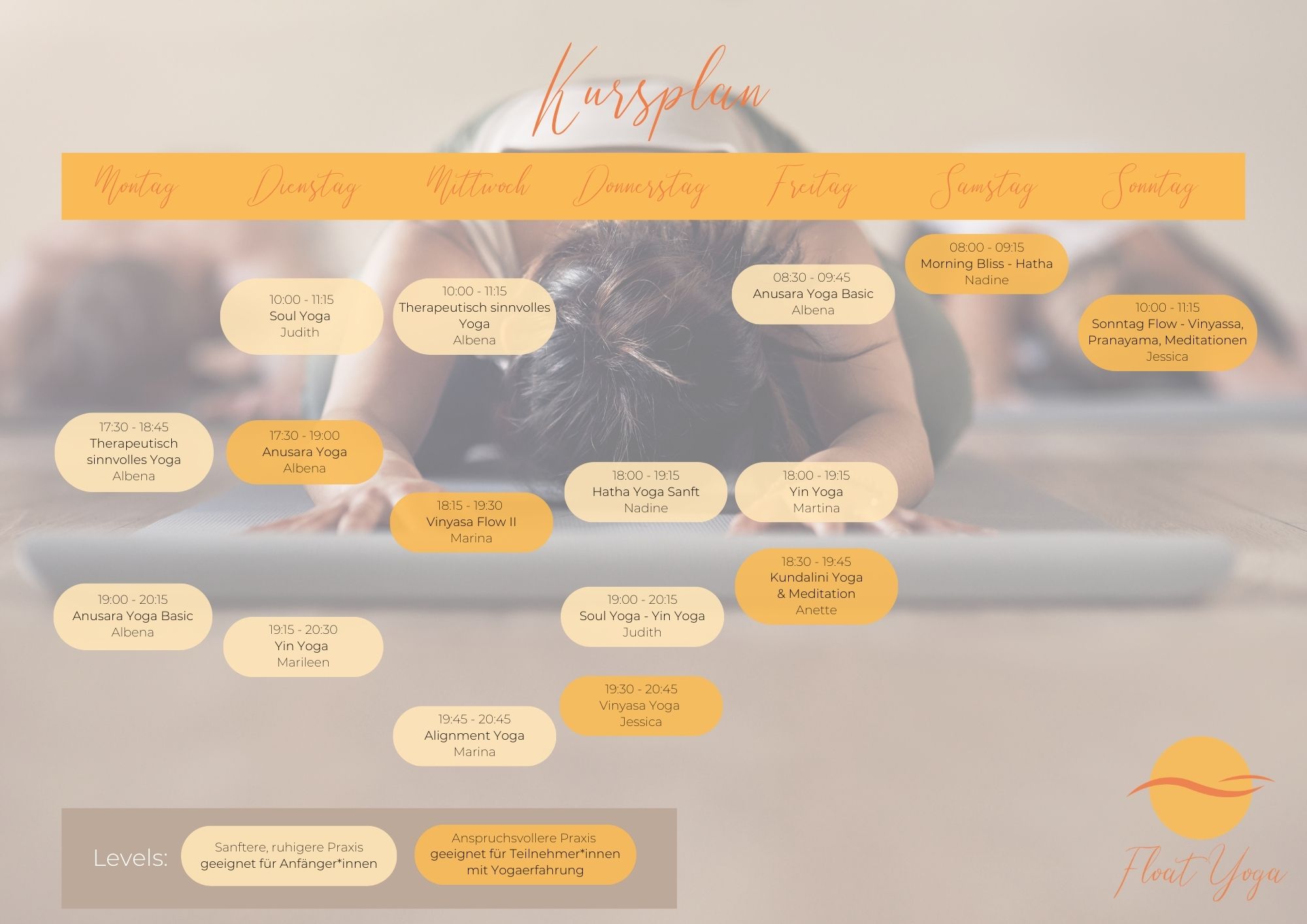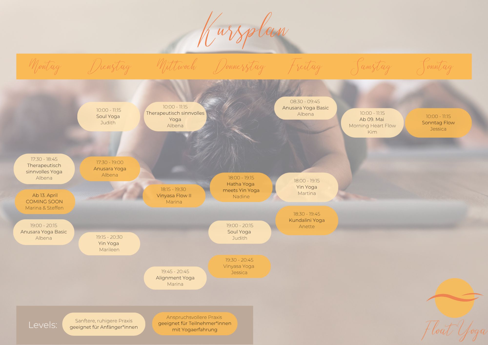 Hier erfährst du mehr über die unterschiedlichen Level in unseren Kursen. Finde den perfekten Kurs für dein Yogalevel. Wir haben dir die einzelnen Kurse farbig markiert.